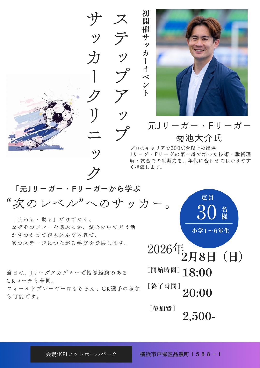 元Jリーガー・Fリーガー 菊池大介氏による、小学1~6年生を対象としたサッカークリニックを開催します。