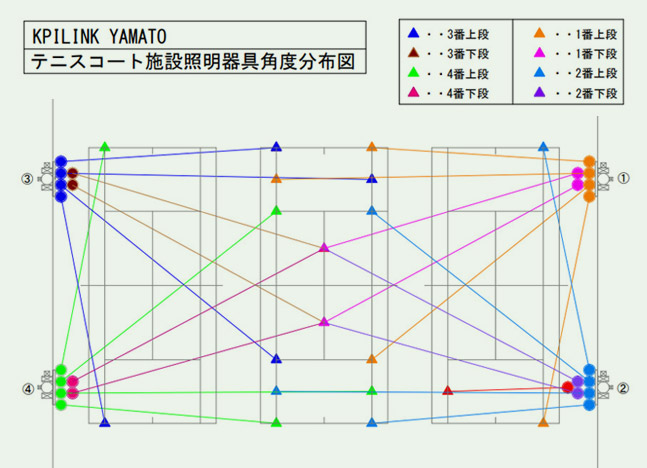 テニスコート内45箇所 平均照度500LXを超える明るさになり、観客のいる国際大会基準になりました。